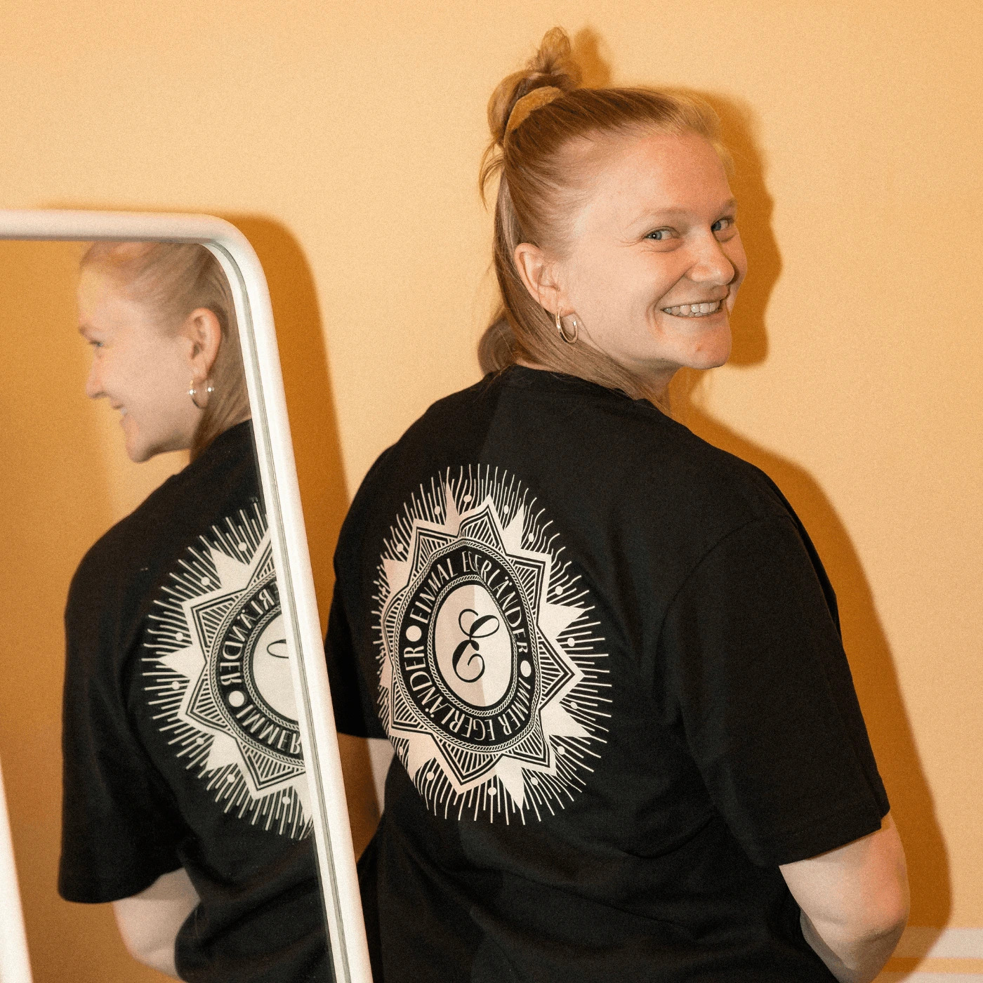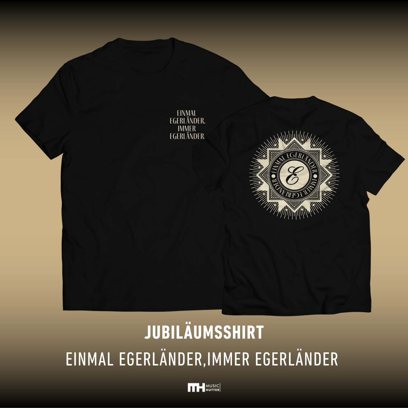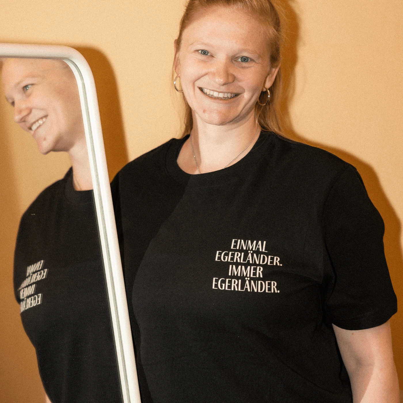 “Einmal Egerländer Immer Egerländer”  auf der Front, Der neue “Egerländer Stern” auf dem Rücken. Schwarz mit gelbem Print, aus 100 % Bio-Baumwolle, Größen S–3XL.